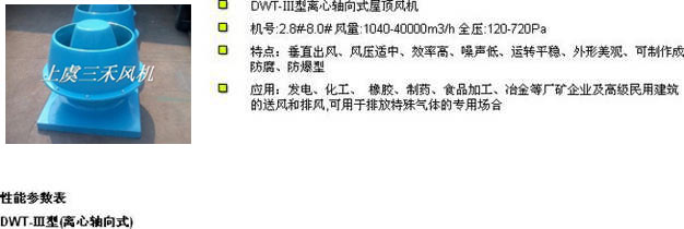 A、轴流式屋顶风机:型号为DWT-Ⅰ型,适用于中低压、大流量的使用场合。根据用户需要还可以设计双向可逆式送排风,即具有正反工况等效特点的风机,如DWT-Ⅴ型屋顶风机。