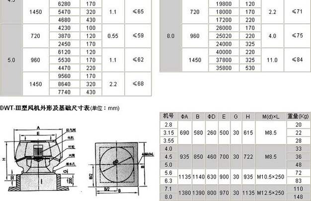 B、离心式无顶风机:型号为DWT-Ⅱ型、BDWT-Ⅲ型两种型式,适用与风量小而压力要求较高的场合;