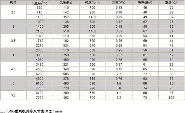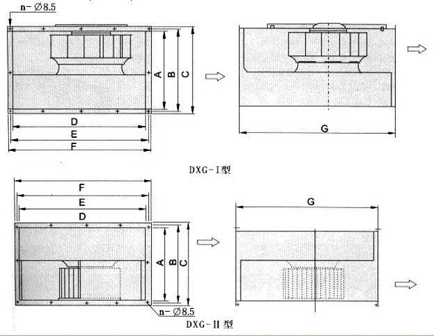 DXG(GDF)矩形管道风机特性及应用 DXG(GDF)矩形管道风机采用低噪声电机与高效离心叶轮直联传动,机壳采用镀锌板TOX免焊铆接工艺制成。独特的矩形进出风口,可直接与风管同轴安装而不需机房,结构紧凑、高度低。具有风量大、风压适中、噪声低、耗电省、安装方便、运行稳定等优点,广泛应用于宾馆、医院、体育馆、图书馆、商场等民用商用建筑工程需要低噪声通风场合。 DXG(GDF)-I型采用后倾翼形离心叶轮,风压较高; DXG(GDF)-II型采用前倾多翼式离心叶轮,风量较大。