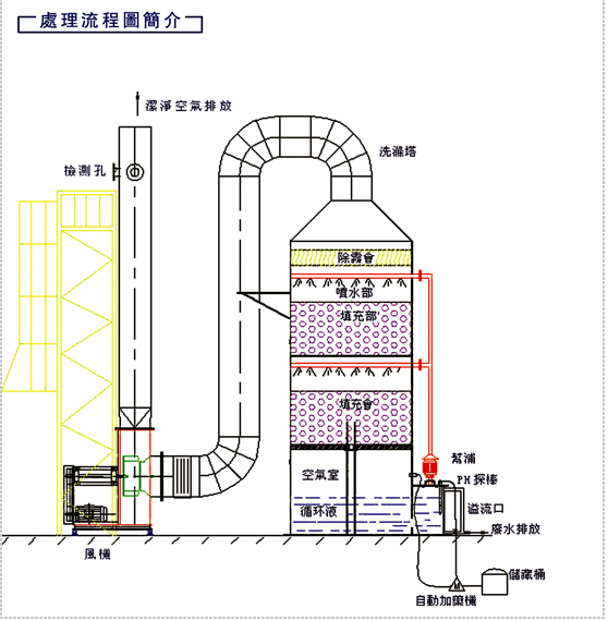 废气由风管吸入,自下而上穿过填料层;循环吸收剂由塔顶通过液体分布器,均匀地喷淋到填料层中,沿着填料层表面向下流动,进入循环水箱。由于上升气流和下降吸收剂在填料中不断接触,上升气流中流质的浓度越来越低,到塔顶时达到排放要求。
