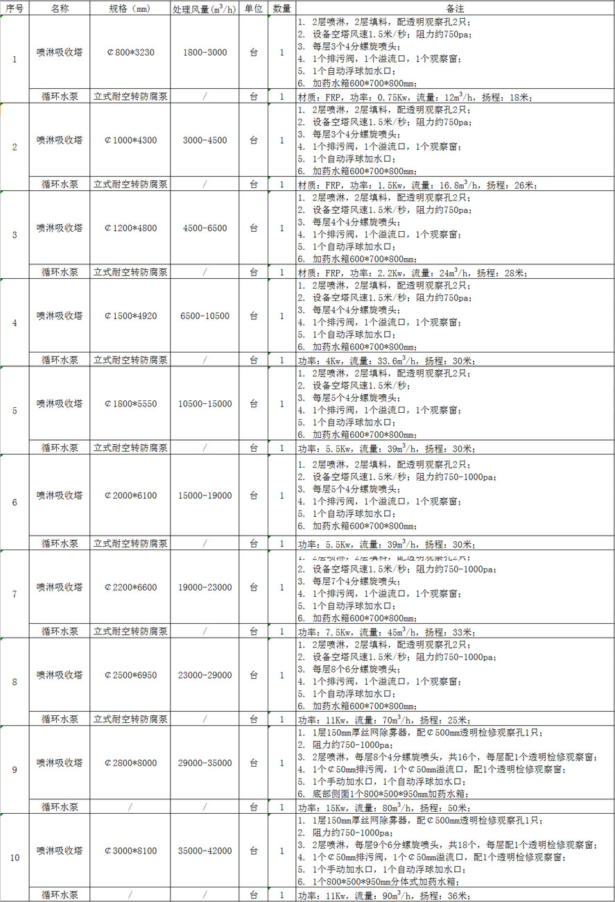 注:公司生产的玻璃钢喷淋塔全部按客户订单要求生产,以下表格参数只做参考使用